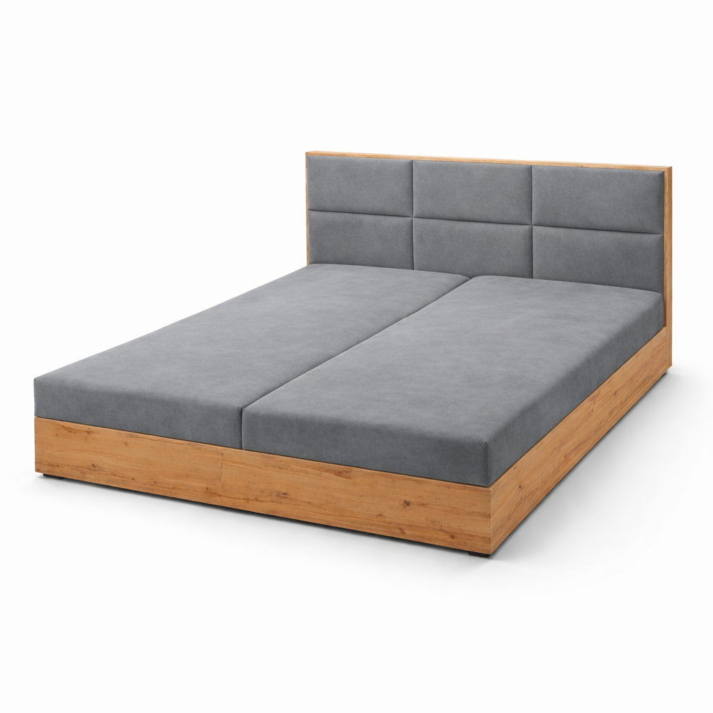 Jednym z najbardziej charakterystycznych elementów łóżka jest wysoki, tapicerowany zagłówek z geometrycznymi przeszyciami, który nie tylko podkreśla styl mebla, ale także zapewnia komfortowe podparcie podczas czytania książki, oglądania telewizji lub wieczornego relaksu.